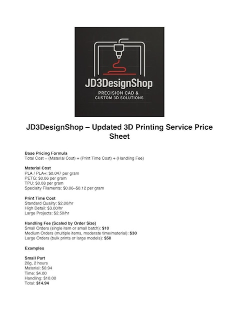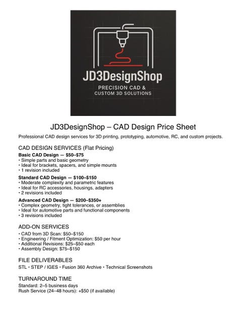 Professional 3D printing for custom parts, prototype, replacements, and small-batch production. Ideal for automotive, Home Improvement, tools, jigs, fixtures, and functional components. What you get: -High quality prints with proper orientation and strength. -Cleaned and inspected parts -Printed from your STL or Designed in-house. -Optional CAD design or part modification available. -Materials- PLA, PETG, TPU, NYLON, ABS, ETC